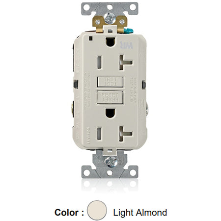 Leviton G5362-WTT, SmartlockPro Weather & Tamper-Resistant Self-Test GFCI Duplex Receptacle, LED Power Indication, Extra Heavy-Duty Industrial Specification Grade, 20A 125V, NEMA 5-20R, 2-Pole, 3-Wire, Back and Side Wired, Self-Grounding, Light Almond