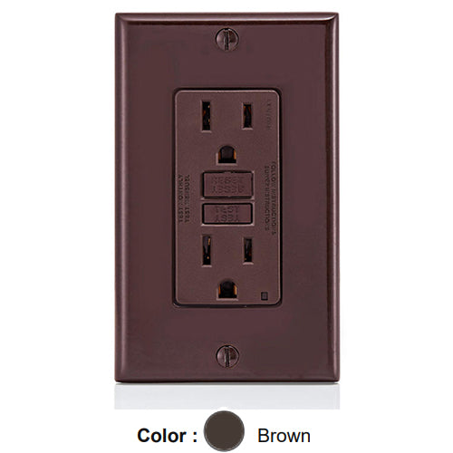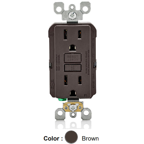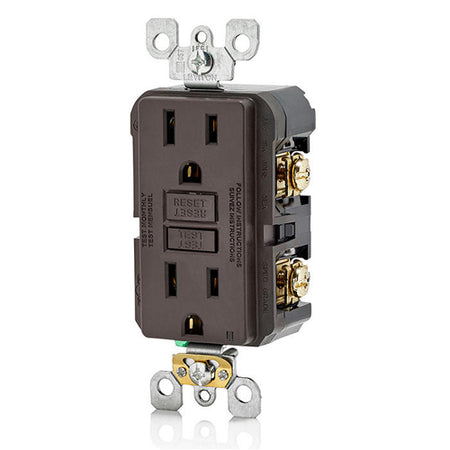 Leviton GFNT1, SmartlockPro Slim Self-Test GFCI Duplex Receptacle, LED Indicator Light, 20 Amp Feed-Through, 15A 125V, NEMA 5-15R, Back & Side Wired, Self-Grounding, Brown