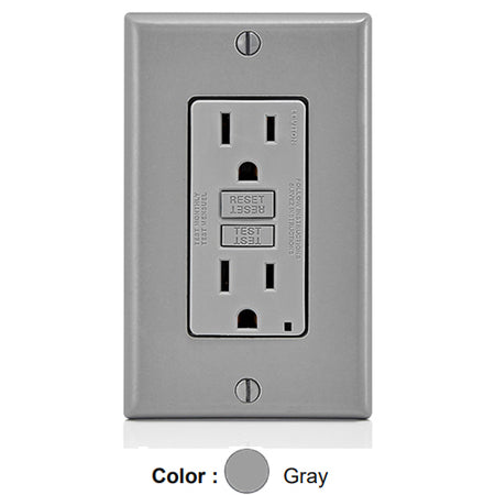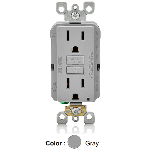 Leviton GFNT1-GY, SmartlockPro Slim Self-Test GFCI Duplex Receptacle, LED Indicator Light, 20 Amp Feed-Through, 15A 125V, NEMA 5-15R, Back & Side Wired, Self-Grounding, Gray