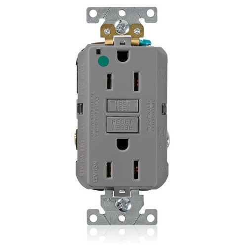 Leviton GFNT1-HGG, SmartlockPro Self-Test GFCI Duplex Receptacle, LED Power Indication, Extra Heavy-Duty Hospital Grade, Wallplate Included, 15A 125V, NEMA 5-15R, 2-Pole, 3-Wire, Self-Grounding, Gray