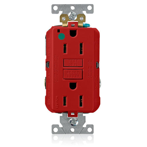 Leviton GFNT1-HGR, SmartlockPro Self-Test GFCI Duplex Receptacle, LED Power Indication, Extra Heavy-Duty Hospital Grade, Wallplate Included, 15A 125V, NEMA 5-15R, 2-Pole, 3-Wire, Self-Grounding, Red