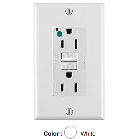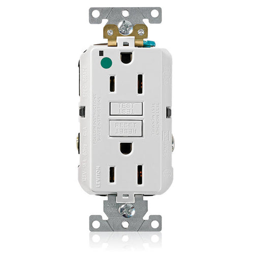Leviton GFNT1-HGW, SmartlockPro Self-Test GFCI Duplex Receptacle, LED Power Indication, Extra Heavy-Duty Hospital Grade, Wallplate Included, 15A 125V, NEMA 5-15R, 2-Pole, 3-Wire, Self-Grounding, White
