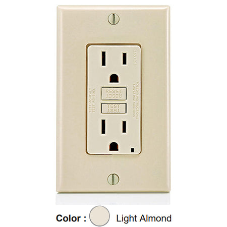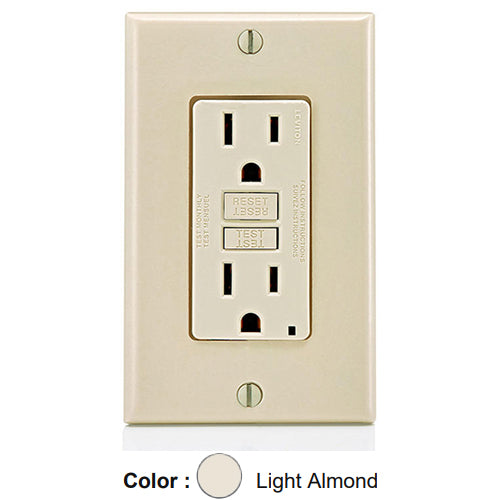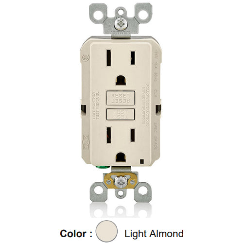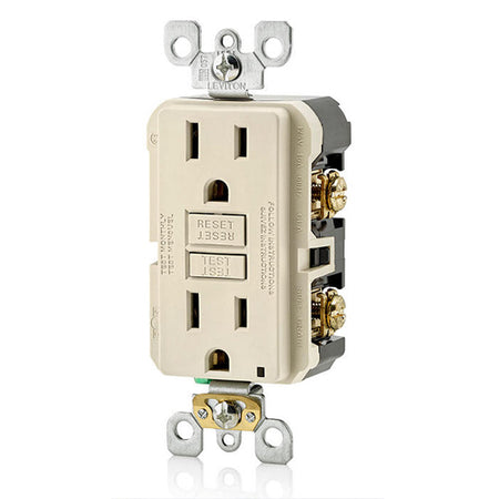 Leviton GFNT1-T, SmartlockPro Slim Self-Test GFCI Duplex Receptacle, LED Indicator Light, 20 Amp Feed-Through, 15A 125V, NEMA 5-15R, Back & Side Wired, Self-Grounding, Light Almond