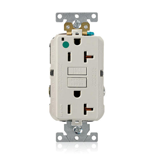 Leviton GFNT2-HGT, SmartlockPro Self-Test GFCI Duplex Receptacle, LED Power Indication, Extra Heavy-Duty Hospital Grade, Wallplate Included, 20A 125V, NEMA 5-20R, 2-Pole, 3-Wire, Self-Grounding, Light Almond