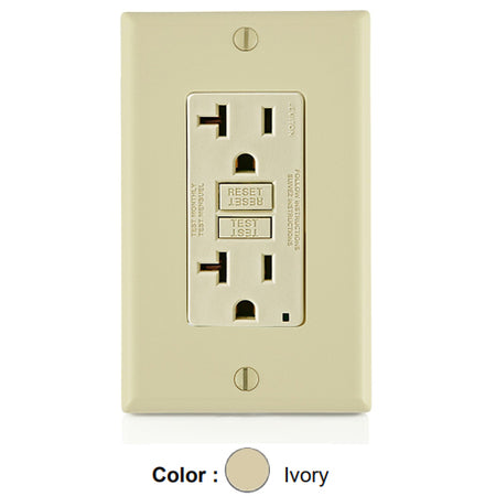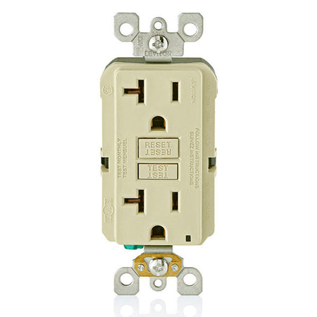 Leviton GFNT2-I, SmartlockPro Slim Self-Test GFCI Duplex Receptacle, LED Indicator Light, 20 Amp Feed-Through, 20A 125V, NEMA 5-20R, Back & Side Wired, Self-Grounding, Ivory