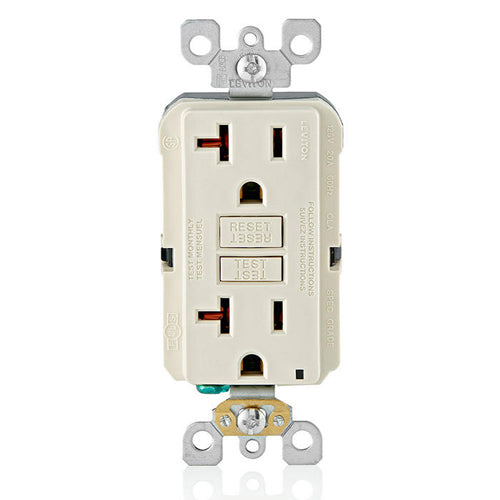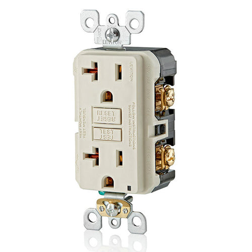 Leviton GFNT2-T, SmartlockPro Slim Self-Test GFCI Duplex Receptacle, LED Indicator Light, 20 Amp Feed-Through, 20A 125V, NEMA 5-20R, Back & Side Wired, Self-Grounding, Light Almond