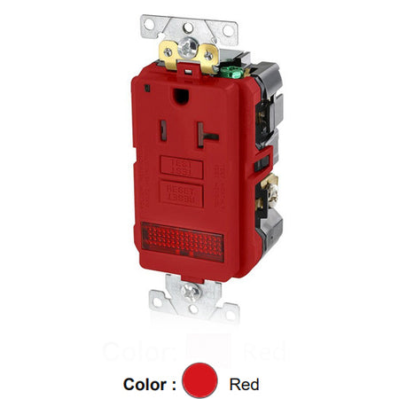 Leviton GFPL2-PLR, SmartlockPro Self-Test GFCI Single Receptacle, Extra Heavy-Duty Industrial Specification Grade, Tamper-Resistant, Pilot Light (Illuminated - ON), 20A 125V, NEMA 5-20R, 2-Pole, 3-Wire, Self-Grounding, Red