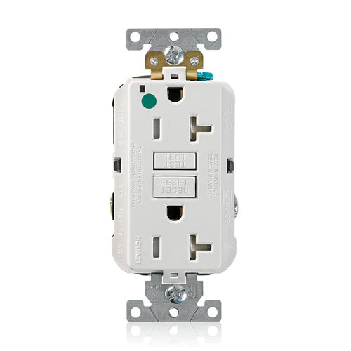Leviton GFTR2-HGW, SmartlockPro Self-Test GFCI Duplex Receptacle, Tamper-Resistant, LED Power Indication, Extra Heavy-Duty Hospital Grade, Wallplate Included, 20A 125V, NEMA 5-20R, 2-Pole, 3-Wire, Self-Grounding, White