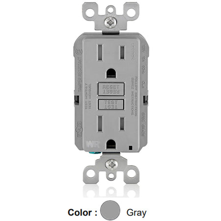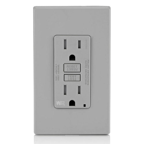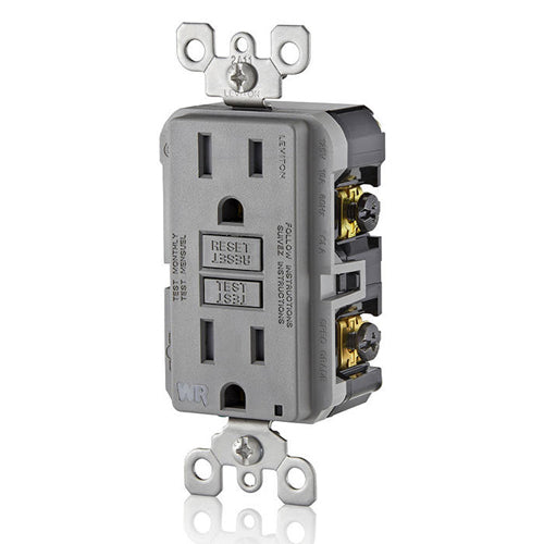 Leviton GFWT1-GY, SmartlockPro Weather & Tamper-Resistant Slim Self-Test GFCI Duplex Receptacle, LED Indicator Light, 20 Amp Feed-Through, 15A 125V, NEMA 5-15R, Back & Side Wired, Gray