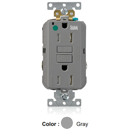 Leviton GFWT1-HGG, SmartlockPro Self-Test GFCI Duplex Receptacle, Weather & Tamper-Resistant, LED Indicator Light, Extra Heavy-Duty Hospital Grade, Wallplate Included, 15A 125V, NEMA 5-15R, 2-Pole, 3-Wire, Self-Grounding, Gray