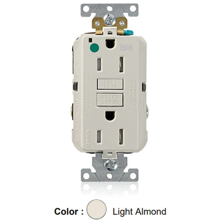 Leviton GFWT1-HGT, SmartlockPro Self-Test GFCI Duplex Receptacle, Weather & Tamper-Resistant, LED Indicator Light, Extra Heavy-Duty Hospital Grade, Wallplate Included, 15A 125V, NEMA 5-15R, 2-Pole, 3-Wire, Self-Grounding, Light Almond