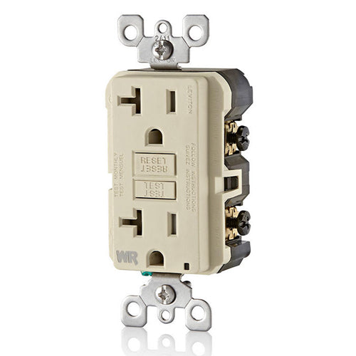 Leviton GFWT2-T, SmartlockPro Slim Self-Test GFCI Duplex Receptacle, Weather-Resistant, LED Indicator Light, 20 Amp Feed-Through, 20A 125V, NEMA 5-20R, Back & Side Wired, Light Almond