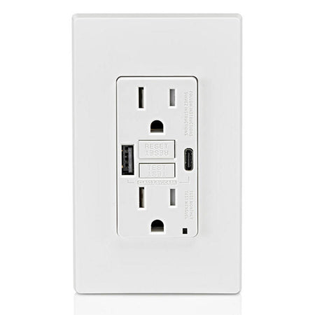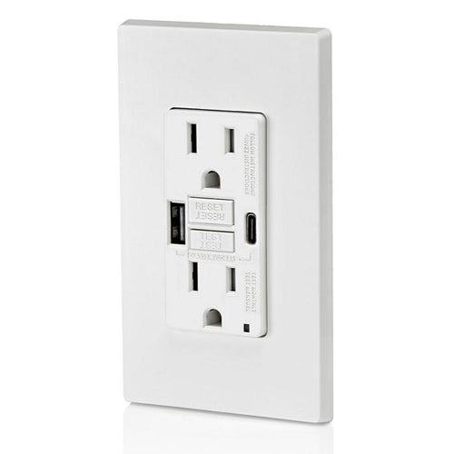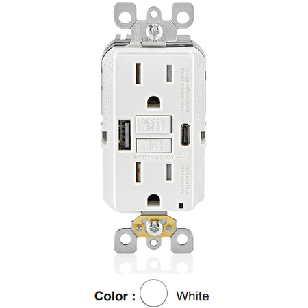 Leviton GUAC1-W, SmartlockPro Self-Test GFCI Combination 24W (4.8A) Type A/C USB In-Wall Charger, Tamper-Resistant Receptacle, 20 Amp Feed-Through, 15A 125V, NEMA 5-15R, Wire Leads, Self-Grounding, White