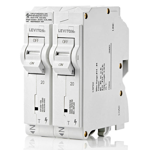 Leviton LSPD2-T, Two 20A Standard Branch Circuit Breakers with Thermal Magnetic Trip Technology and Plug-On Installation Offering Type-1 Surge Protection for the Entire Home, 120V, White