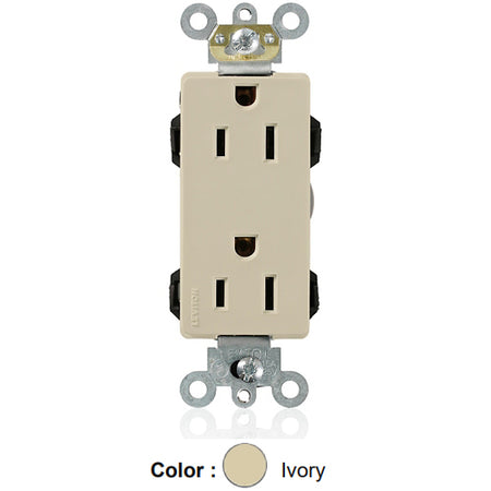 Leviton M1626-I, Lev-Lok Decora Plus Straight Blade Duplex Receptacle, Heavy-Duty Industrial Specification Grade, Smooth Face, 15A 125V, NEMA 5-15R, 2-Pole, 3-Wire, Modular Terminals, Ivory