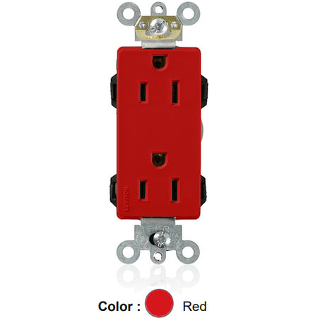 Leviton M1626-R, Lev-Lok Decora Plus Straight Blade Duplex Receptacle, Heavy-Duty Industrial Specification Grade, Smooth Face, 15A 125V, NEMA 5-15R, 2-Pole, 3-Wire, Modular Terminals, Red