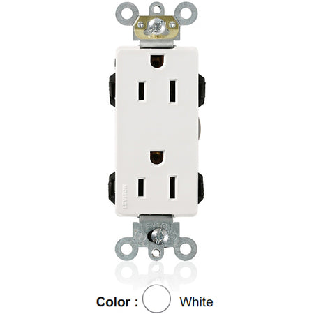 Leviton M1626-W, Lev-Lok Decora Plus Straight Blade Duplex Receptacle, Heavy-Duty Industrial Specification Grade, Smooth Face, 15A 125V, NEMA 5-15R, 2-Pole, 3-Wire, Modular Terminals, White