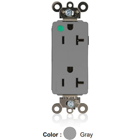 Leviton M1636-ILG, Lev-Lok Decora Plus Straight Blade Duplex Receptacle, Extra Heavy-Duty Hospital Grade, Illuminated, Smooth Face, 20A 125V, NEMA 5-20R, 2-Pole, 3-Wire, Modular Terminals, Gray