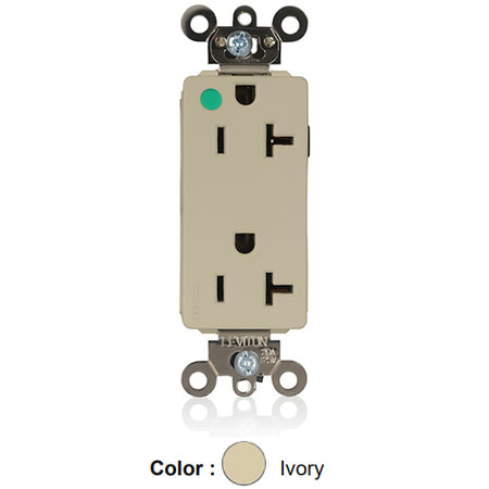 Leviton M1636-ILI, Lev-Lok Decora Plus Straight Blade Duplex Receptacle, Extra Heavy-Duty Hospital Grade, Illuminated, Smooth Face, 20A 125V, NEMA 5-20R, 2-Pole, 3-Wire, Modular Terminals, Ivory