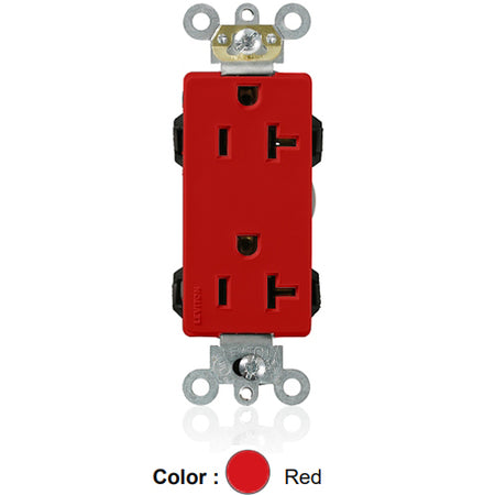 Leviton M1636-R, Lev-Lok Decora Plus Straight Blade Duplex Receptacle, Heavy-Duty Industrial Specification Grade, Smooth Face, 20A 125V, NEMA 5-20R, 2-Pole, 3-Wire, Modular Terminals, Red