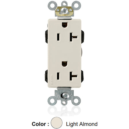 Leviton M1636-T, Lev-Lok Decora Plus Straight Blade Duplex Receptacle, Heavy-Duty Industrial Specification Grade, Smooth Face, 20A 125V, NEMA 5-20R, 2-Pole, 3-Wire, Modular Terminals, Light Almond