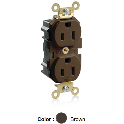 Leviton M5262, Lev-Lok Straight Blade Duplex Receptacle, Extra Heavy-Duty Industrial Specification Grade, Smooth Face, 15A 125V, NEMA 5-15R, 2-Pole, 3-Wire, Modular Terminals, Brass Strap, Brown