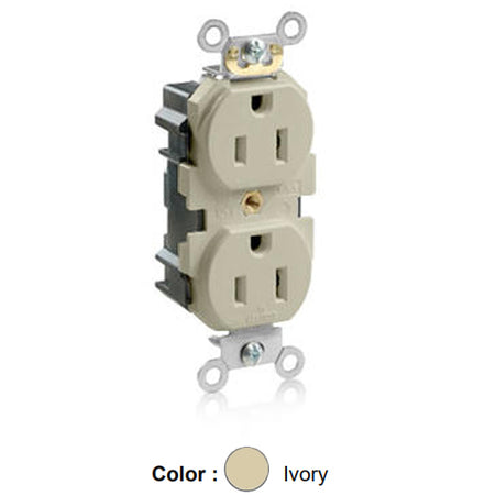 Leviton M5262-SI, Lev-Lok Straight Blade Duplex Receptacle, Heavy-Duty Industrial Specification Grade, Smooth Face, 15A 125V, NEMA 5-15R, 2-Pole, 3-Wire, Modular Terminals, Ivory