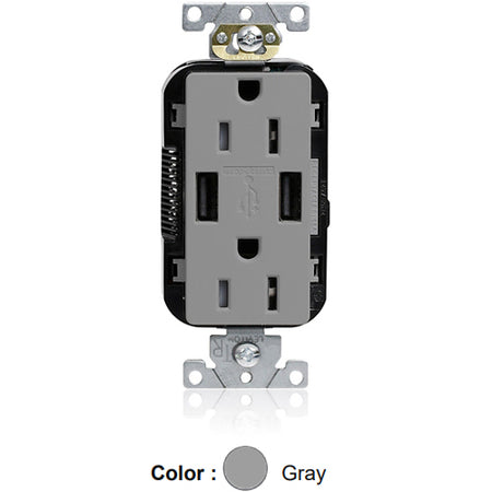 Leviton M56AA-GY, Lev-Lok Combination Decora Straight Blade Duplex Receptacle, Dual-Port USB Type A-A Charger, Commercial Specification Grade, Tamper-Resistant, 15A 125V, NEMA 5-15R, 2-Pole, 3-Wire, Modular Terminals, Gray