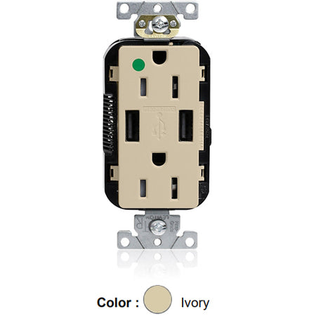 Leviton M56AA-HGI, Lev-Lok Combination Decora Straight Blade Duplex Receptacle, Dual-Port USB Type A-A Charger, Heavy-Duty Hospital Grade, Tamper-Resistant, 15A 125V, NEMA 5-15R, 2-Pole, 3-Wire, Modular Terminals, Ivory