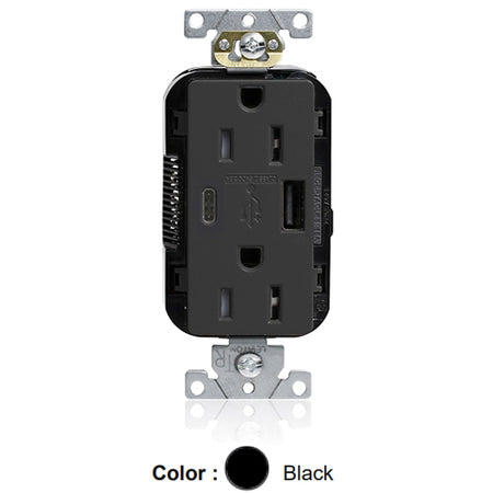 Leviton M56AC-E, Lev-Lok Combination Decora Straight Blade Duplex Receptacle, Dual-Port USB Type A/C Charger, Commercial Specification Grade, Tamper-Resistant, 15A 125V, NEMA 5-15R, 2-Pole, 3-Wire, Modular Terminals, Black