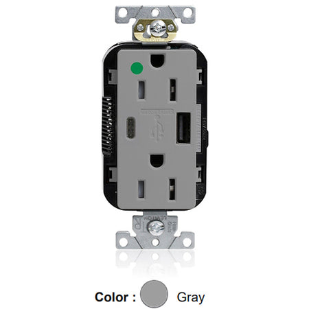 Leviton M56AC-HGG, Lev-Lok Combination Decora Straight Blade Duplex Receptacle, Dual-Port USB Type A/C Charger, Heavy-Duty Hospital Grade, Tamper-Resistant, 15A 125V, NEMA 5-15R, 2-Pole, 3-Wire, Modular Terminals, Gray