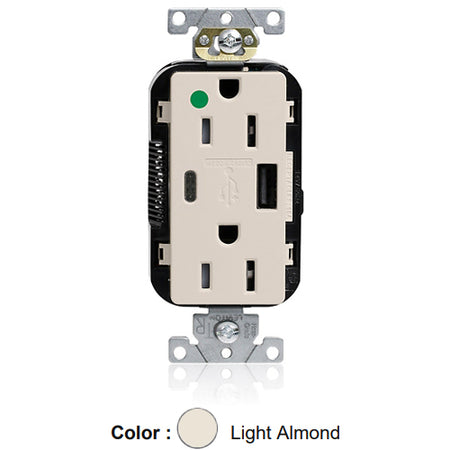 Leviton M56AC-HGT, Lev-Lok Combination Decora Straight Blade Duplex Receptacle, Dual-Port USB Type A/C Charger, Heavy-Duty Hospital Grade, Tamper-Resistant, 15A 125V, NEMA 5-15R, 2-Pole, 3-Wire, Modular Terminals, Light Almond