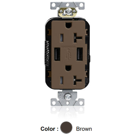 Leviton M58AA, Lev-Lok Combination Decora Straight Blade Duplex Receptacle, Dual-Port USB Type A-A Charger, Commercial Specification Grade, Tamper-Resistant, 20A 125V, NEMA 5-20R, 2-Pole, 3-Wire, Modular Terminals, Brown