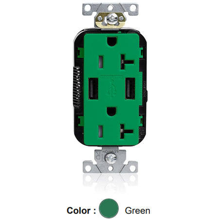 Leviton M58AA-N, Lev-Lok Combination Decora Straight Blade Duplex Receptacle, Dual-Port USB Type A-A Charger, Commercial Specification Grade, Tamper-Resistant, 20A 125V, NEMA 5-20R, 2-Pole, 3-Wire, Modular Terminals, Green