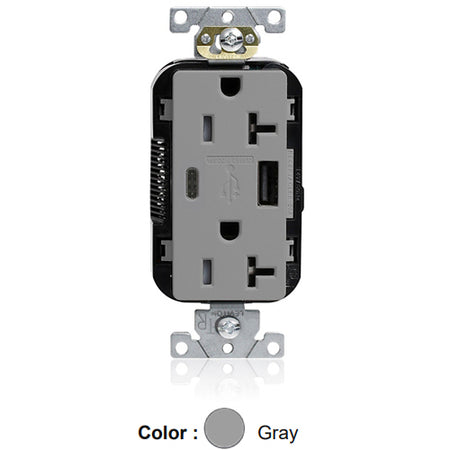 Leviton M58AC-GY, Lev-Lok Combination Decora Straight Blade Duplex Receptacle, Dual-Port USB Type A/C Charger, Commercial Specification Grade, Tamper-Resistant, 20A 125V, NEMA 5-20R, 2-Pole, 3-Wire, Modular Terminals, Gray