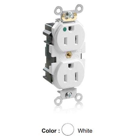 Leviton M8200-HW, Lev-Lok Straight Blade Duplex Receptacle, Heavy-Duty Hospital Grade, Smooth Face, 15A 125V, NEMA 5-15R, 2-Pole, 3-Wire, Modular Terminals, White