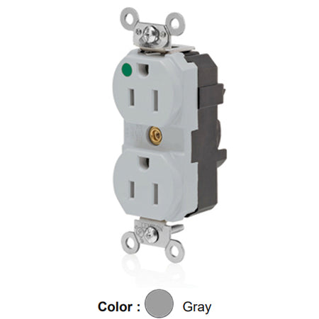 Leviton M8200-ILG, Lev-Lok Straight Blade Duplex Receptacle, Extra Heavy-Duty Hospital Grade, Illuminated, Smooth Face, 15A 125V, NEMA 5-15R, 2-Pole, 3-Wire, Modular Terminals, Nickel-Plated Brass Strap, Gray