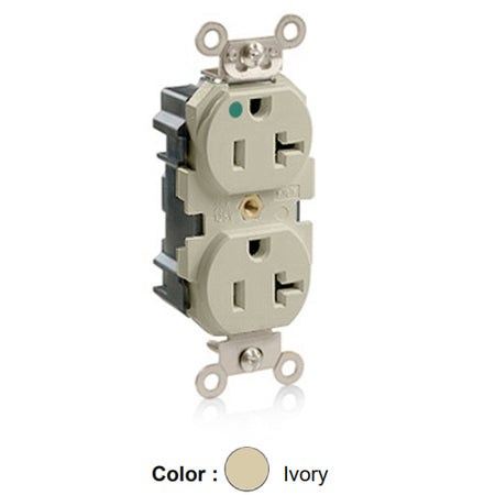 Leviton M8300-I, Lev-Lok Straight Blade Duplex Receptacle, Extra Heavy-Duty Hospital Grade, Smooth Face, 20A 125V, NEMA 5-20R, 2-Pole, 3-Wire, Modular Terminals, Nickel-Plated Brass Strap, Ivory