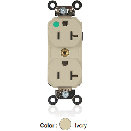 Leviton M8300-ILI, Lev-Lok Straight Blade Duplex Receptacle, Extra Heavy-Duty Hospital Grade, Illuminated, Smooth Face, 20A 125V, NEMA 5-20R, 2-Pole, 3-Wire, Modular Terminals, Nickel-Plated Brass Strap, Ivory