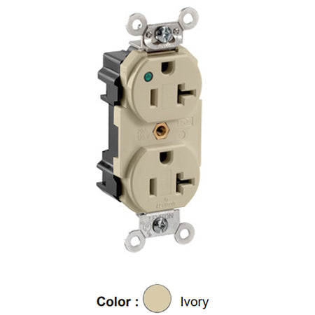 Leviton M8300-PLI, Lev-Lok Straight Blade Duplex Receptacle, Extra Heavy-Duty Hospital Grade, Power Indication, Smooth Face, 20A 125V, NEMA 5-20R, 2-Pole, 3-Wire, Modular Terminals, Nickel-Plated Brass Strap, Ivory