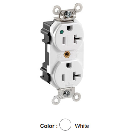 Leviton M8300-PLW, Lev-Lok Straight Blade Duplex Receptacle, Extra Heavy-Duty Hospital Grade, Power Indication, Smooth Face, 20A 125V, NEMA 5-20R, 2-Pole, 3-Wire, Modular Terminals, Nickel-Plated Brass Strap, White