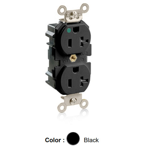 Leviton M8300-SGE, Lev-Lok Straight Blade Duplex Receptacle, Extra Heavy-Duty Hospital Grade, Tamper-Resistant, Smooth Face, 20A 125V, NEMA 5-20R, 2-Pole, 3-Wire, Modular Terminals, Nickel Plated Brass Strap, Black