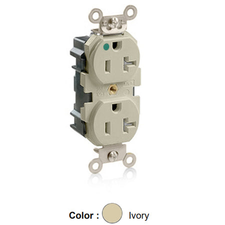 Leviton M8300-SGI, Lev-Lok Straight Blade Duplex Receptacle, Extra Heavy-Duty Hospital Grade, Tamper-Resistant, Smooth Face, 20A 125V, NEMA 5-20R, 2-Pole, 3-Wire, Modular Terminals, Nickel Plated Brass Strap, Ivory