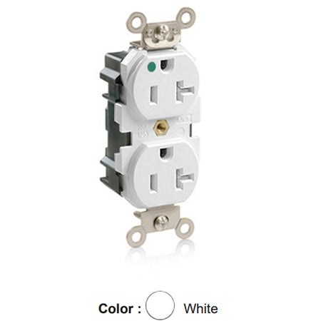 Leviton M8300-SGW, Lev-Lok Straight Blade Duplex Receptacle, Extra Heavy-Duty Hospital Grade, Tamper-Resistant, Smooth Face, 20A 125V, NEMA 5-20R, 2-Pole, 3-Wire, Modular Terminals, Nickel Plated Brass Strap, White