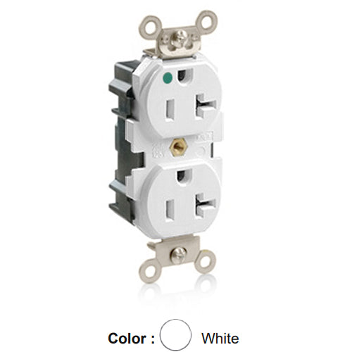Leviton M8300-W, Lev-Lok Straight Blade Duplex Receptacle, Extra Heavy-Duty Hospital Grade, Smooth Face, 20A 125V, NEMA 5-20R, 2-Pole, 3-Wire, Modular Terminals, Nickel-Plated Brass Strap, White