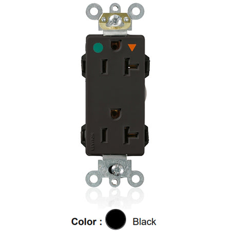 Leviton MD830-IGE, Lev-Lok Decora Plus Straight Blade Duplex Receptacle, Heavy-Duty Hospital Grade, Isolated Ground, Smooth Face, 20A 125V, NEMA 5-20R, 2-Pole, 3-Wire, Modular Terminals, Black
