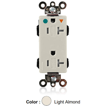Leviton MDT83-IGT, Lev-Lok Decora Plus Straight Blade Duplex Receptacle, Heavy-Duty Hospital Grade, Tamper-Resistant, Isolated Ground, Smooth Face, 20A 125V, NEMA 5-20R, 2-Pole, 3-Wire, Modular Terminals, Light Almond
