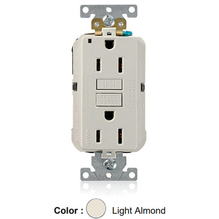 Leviton MGFN1-T, Lev-Lok SmartlockPro Self-Test GFCI Duplex Receptacle, Power Indication, Extra Heavy-Duty Industrial Specification Grade, 15A 125V, NEMA 5-15R, 2-Pole, 3-Wire, Self-Grounding, Light Almond