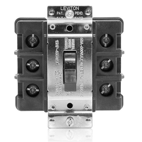 Leviton MS603-FW, Three-Phase Single Throw AC Manual Motor Controller Component Switch, Standard Toggle, Industrial Grade, 60 Amp, 600 Volt, 3-Pole, Non-Grounding, Front Wired, Black