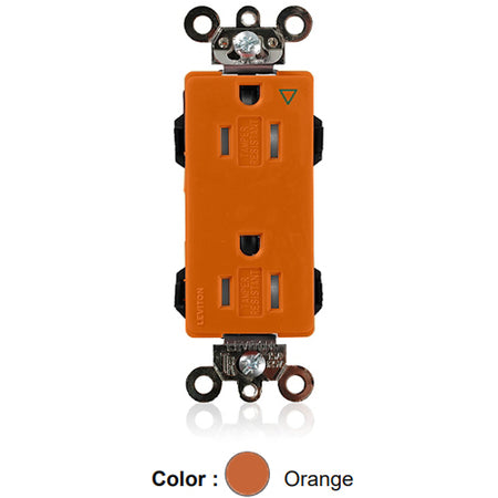 Leviton MT162-IG, Lev-Lok Decora Plus Straight Blade Duplex Receptacle, Heavy-Duty Industrial Specification Grade, Isolated Ground, Tamper-Resistant, Smooth Face, 15A 125V, NEMA 5-15R, 2-Pole, 3-Wire, Modular Terminals, Orange